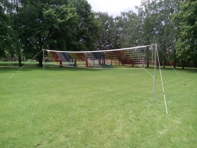 Beachvolleyball net for leisure time. Coloured knot netting from polypropylene 2 mm, mesh size 100 mm. Top: polyester white headband 50 mm, cord head line 12,5 m, 4 tension ropes.